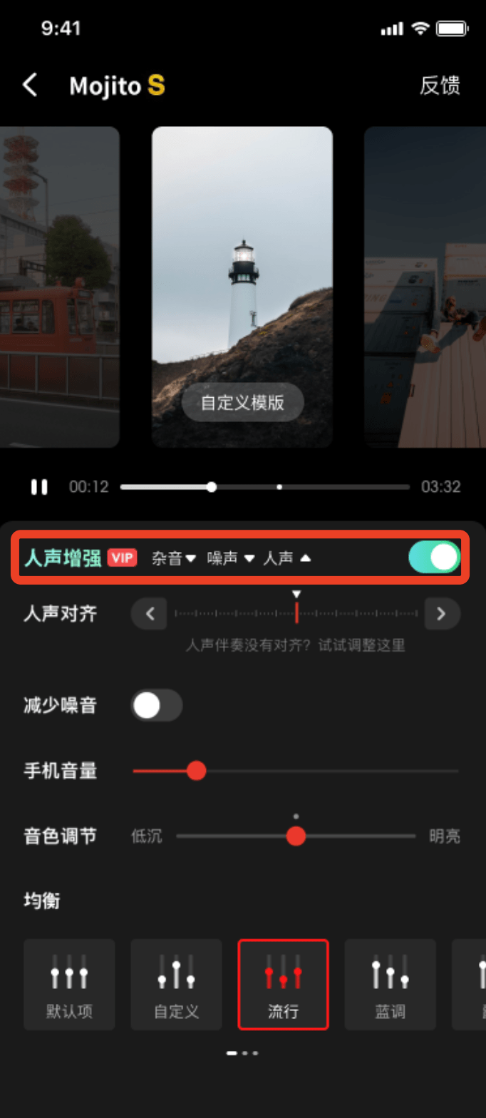 人声增强功能根据收声情况识别用户性别、音色,通过人声激励弥补录唱设备造成的缺陷,让男声更饱满,女声更明亮。VIP用户可在录唱后进入作品编辑页,点击人声均衡后拉起的面板内找到人声增强开关。