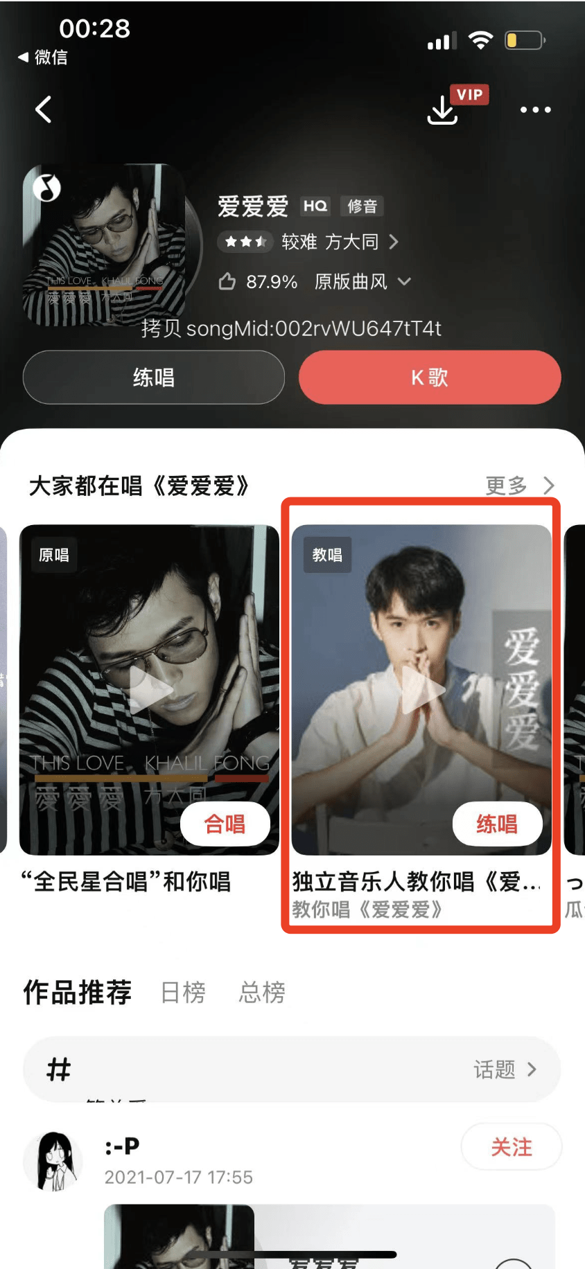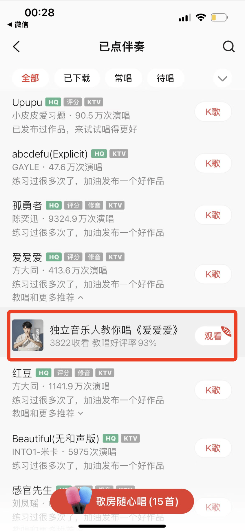 平台为VIP用户免费提供由专业声乐导师录制的单曲教学课程,每条教程课程内导师都会以某一伴奏为例,精讲发声技巧与情感表达,帮助你完美演绎这首伴奏。VIP用户可在伴奏详情页、已点列表等多处找到单曲教唱作品。