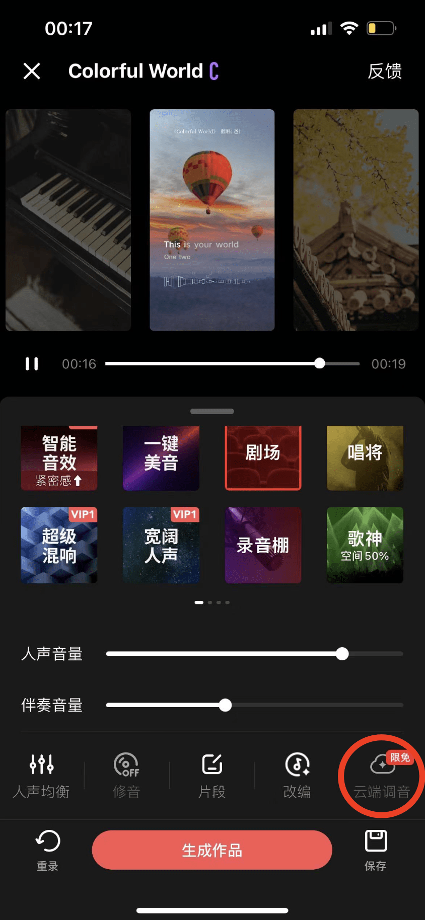 云端调音使用由专业混音师提供的商业混音模版,在云端对作品进行接近专业发行级别的加工编辑。VIP用户可在录唱后进入作品编辑预览页使用。