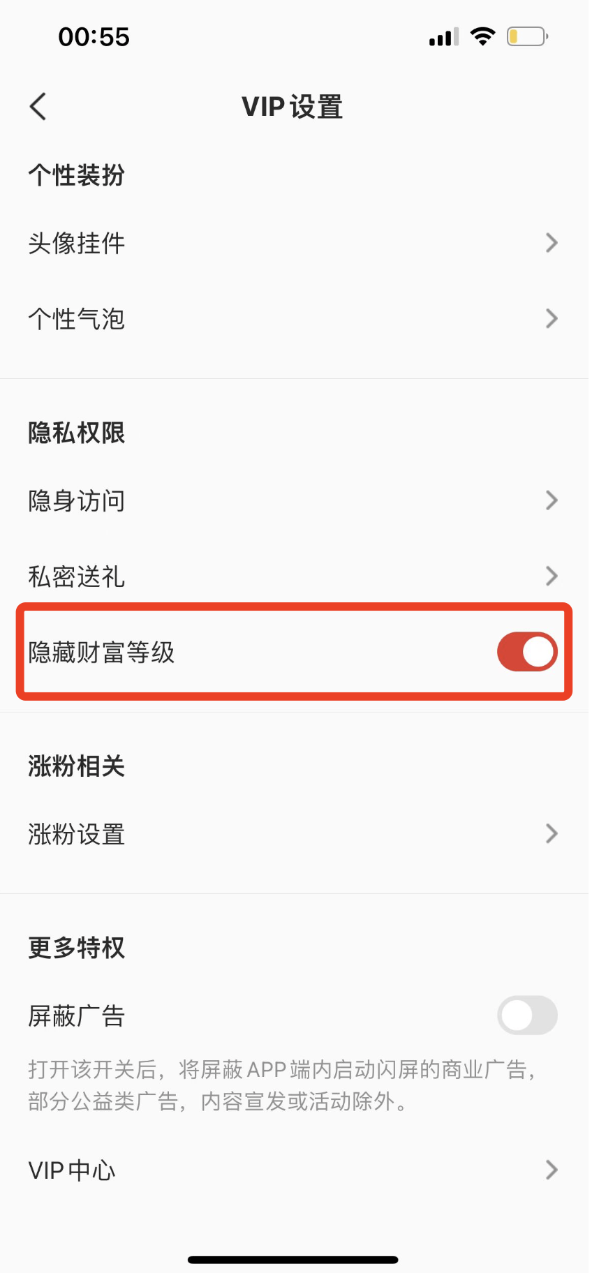平台支持隐藏VIP用户在个人主页的财富等级信息。VIP用户可在VIP设置页内开启隐藏财富等级开关。