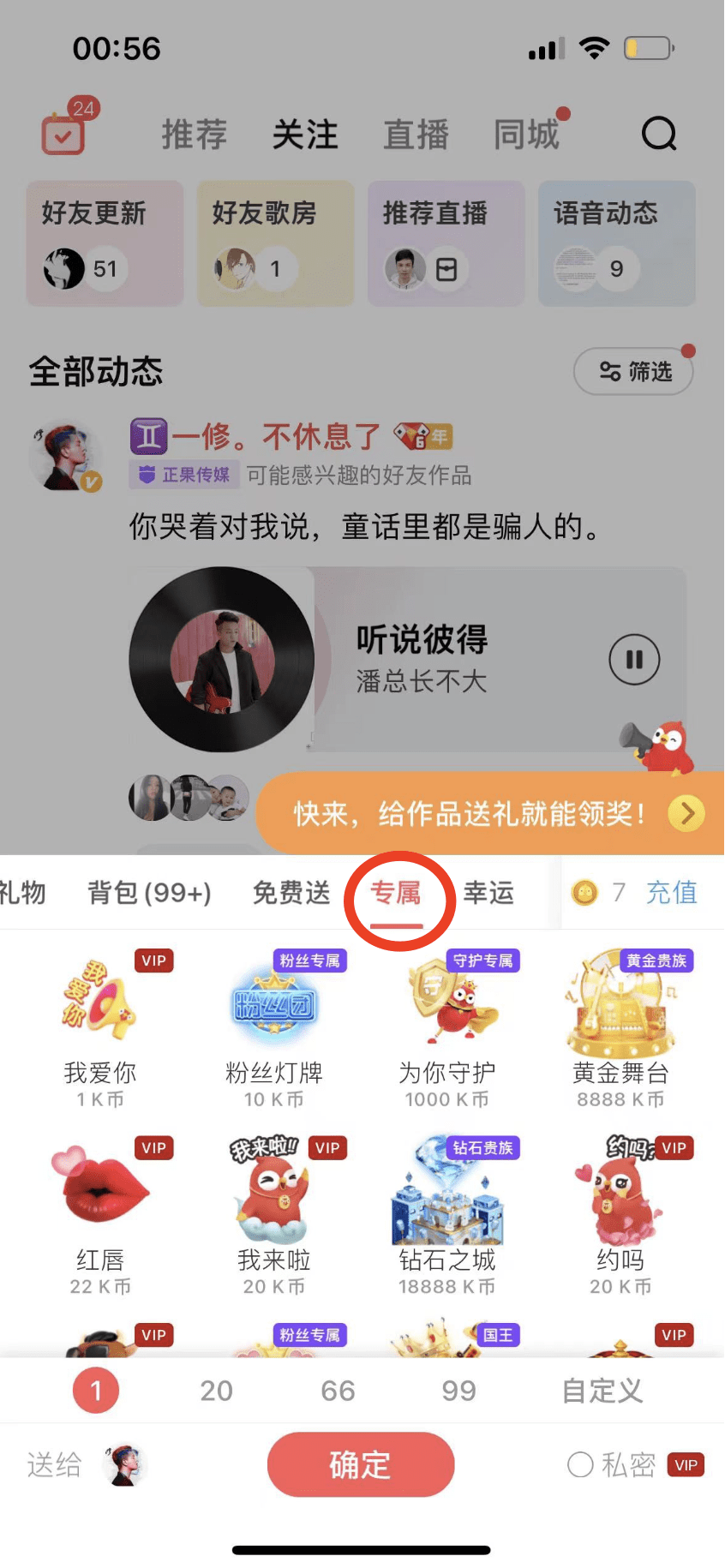 VIP用户享VIP定制送礼道具使用权。VIP用户可在送礼面板内专属分类下查看VIP礼物道具。