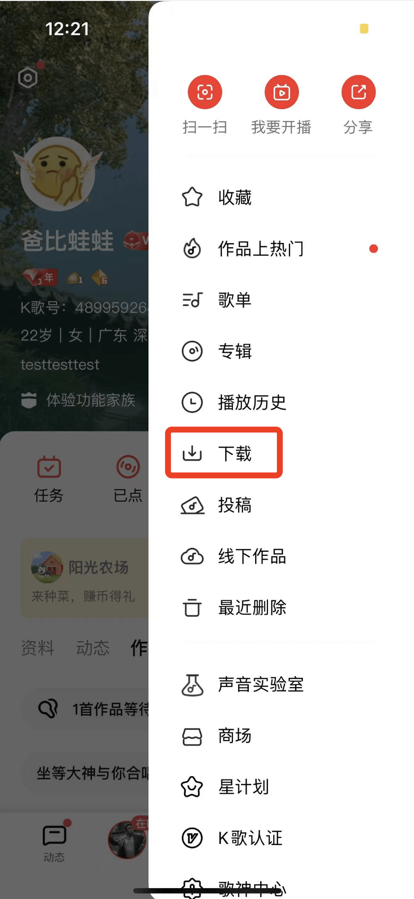 平台支持VIP用户导出已下载的录唱作品,由于版权问题,仅支持导出自己的作品至手机本地。VIP用户可在个人主页点击右上角按钮后打开的面板内找到下载,由此进入下载页导出作品。