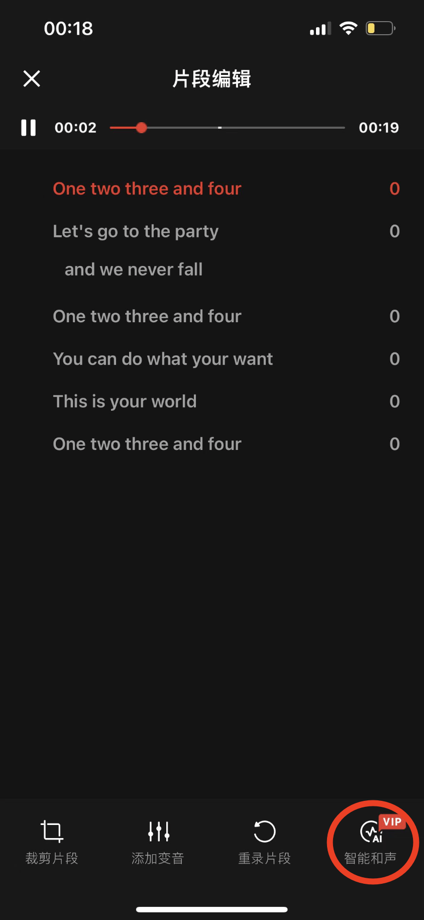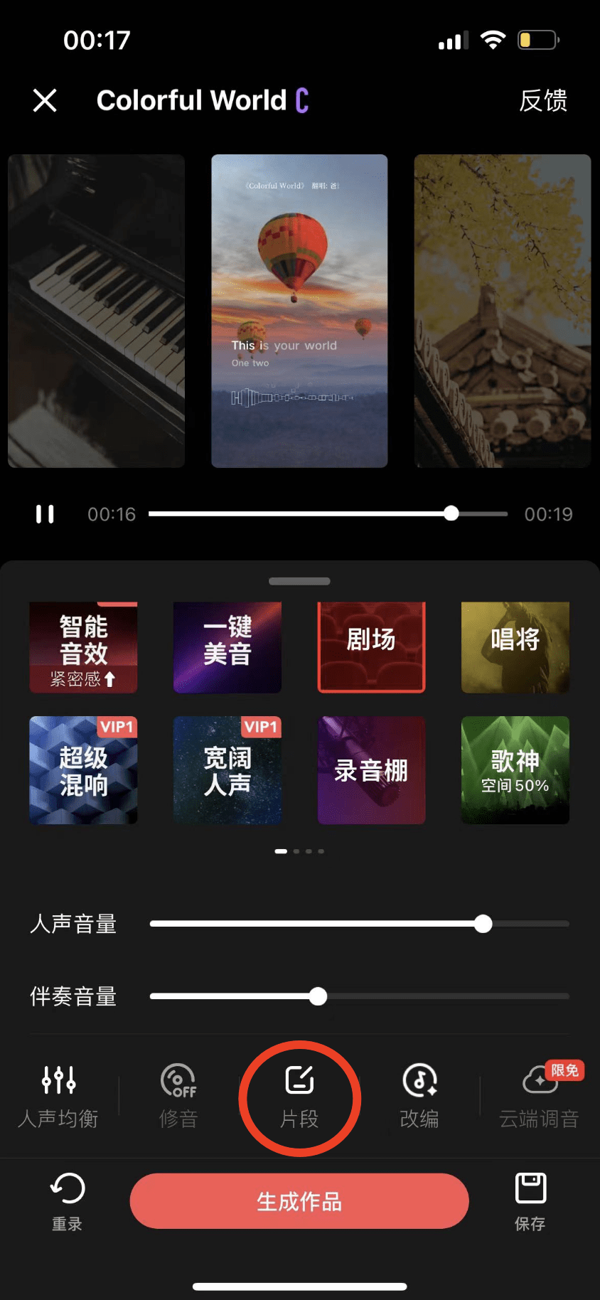 类比专业合唱团伴唱的听觉效果,智能和声会筛选出作品内合适片段并为其添加动听和声。VIP用户可在作品编辑预览页点击片段按钮拉起的片段编辑页内找到该功能。