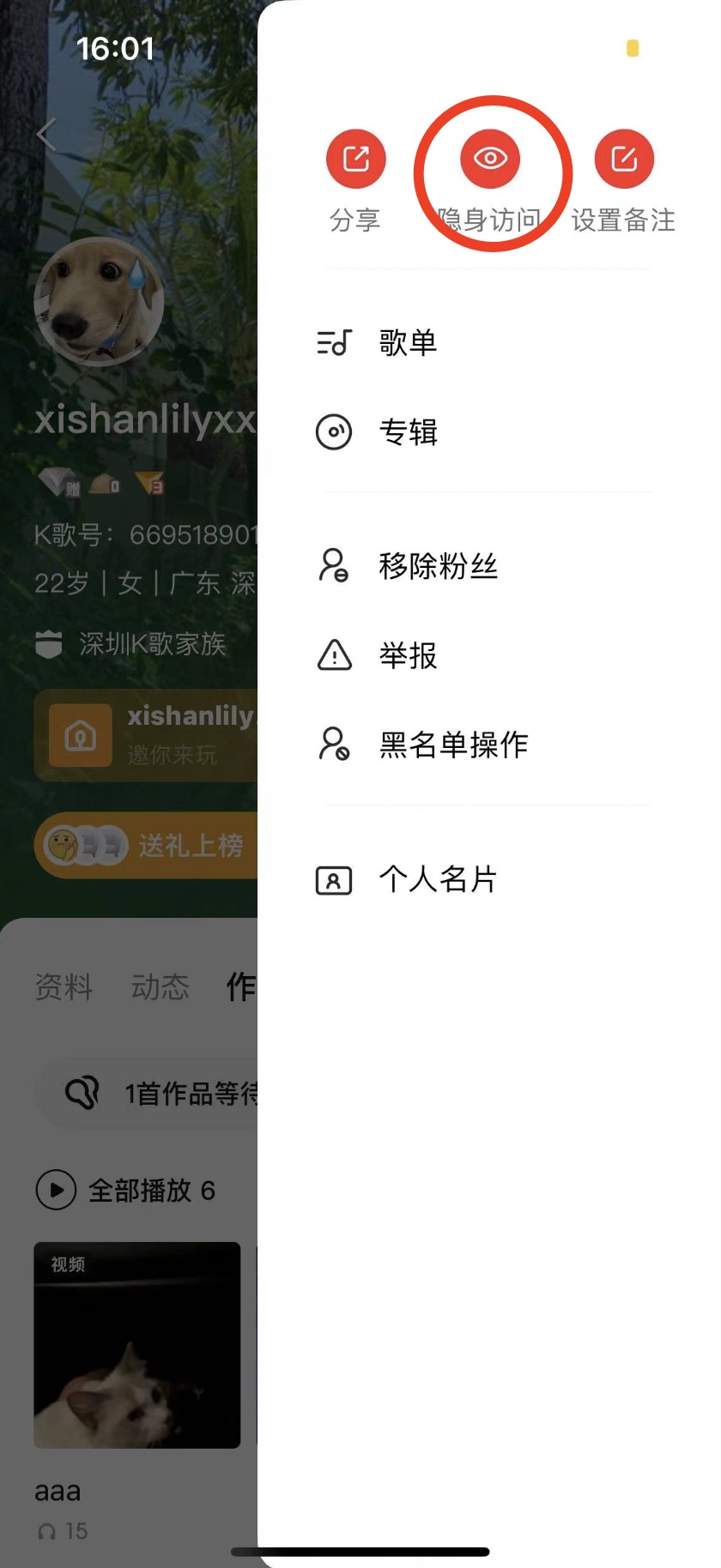 可将好友或陌生人设置为隐身访问对象。隐身访问状态覆盖全站场景,如播放作品、访问个人主页不留记录,进入对方的歌房或直播间显示为游客态。VIP用户与隐身访问对象之间可正常使用私信功能,私信页内会显示正常的头像和昵称。VIP用户可在VIP设置页管理隐身访问对象名单,或在隐身访问对象个人主页点击右上角按钮后打开的面板内对该用户进行隐身访问设置。