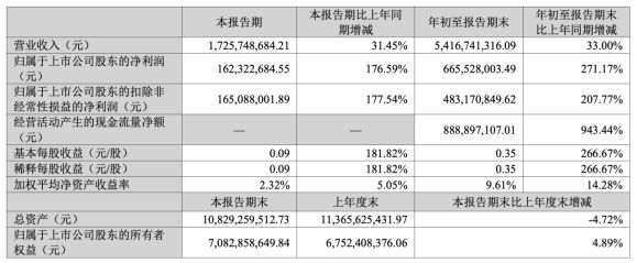 公司第三季度实现营业收入17.26亿元,同比增长31.45%,归母净利润为1.62亿元,同比大幅增长176.59%。在今年前三季度,公司营业收入达54.17亿元,同比增长33.00%,归母净利润6.66亿元。