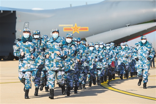 二月十七日,刚下飞机的医疗队员列队跑步离开停机坪。按照中央军委命令,二月十七日凌晨,空军出动包括国产运-20在内的三型八架运输机第四次向武汉空运六百七十六名军队支援湖北医疗队队员和一批医疗物资。新华社记者 李贺摄
