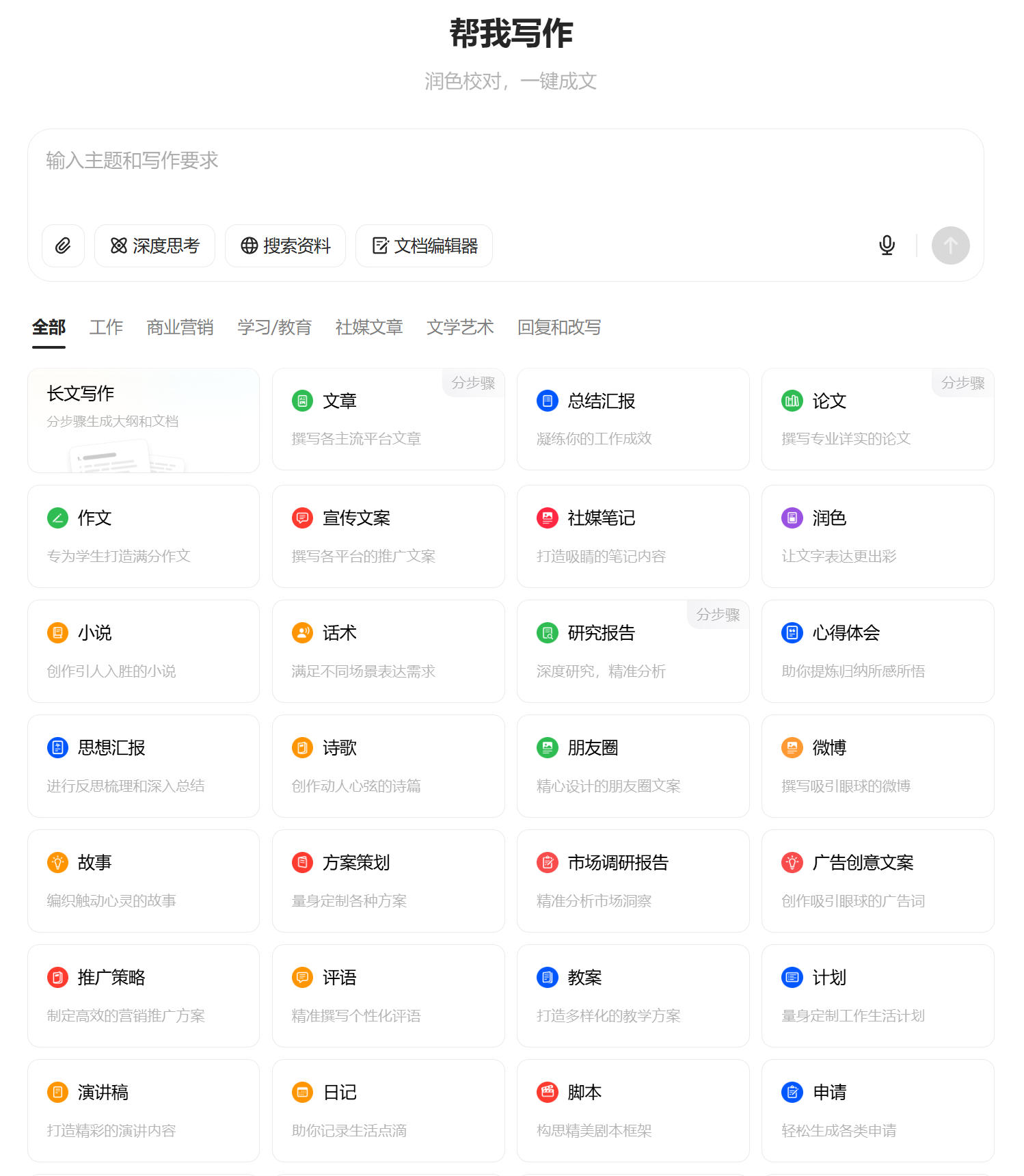 适用场景职场文书(周报、邮件、PPT 文案)、学生作业(作文、读后感)、社交文案(朋友圈、小红书)、生活应用(请假条、邀请函)等。