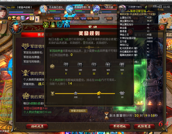 1,58魔域发布网发布站副本打的时候有奖励,别人打了军团副本,你只要做了物资有奖励开箱子领取,奖励包括神主属性幻化,幸运值,装备神佑值等等,前十是在奖励的基础上双倍奖励,前二十是1.5倍奖励,前100名都有奖励拿。需要提醒的是,开箱子的奖励是随机的,不满意你可以花魔石重置奖励。【感觉又是抽奖的坑……】