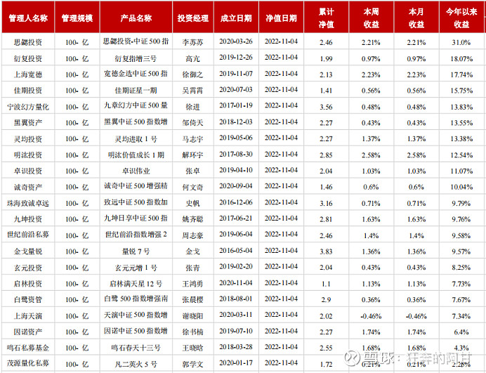 量化指增的策略简单概括就是:一方面通过足够分散的持仓,确保获得市场的贝塔收益;另一方面通过从海量数据挖掘出来的各类因子来割韭菜,从而获得阿尔法收益。贝塔方面,各类历史数据都已经证明A股的长期收益是不差的;阿尔法方面,在A股这个散户占比还很高、有效性还比较差的市场,主流量化机构相对于散户和游资依然具有碾压优势,目前还在红利期内。可以说这两块收益都是确定性比较高的,熊市通过超额收益的积累减少亏损,牛市绝对不会踏空,确定性完胜绝大部分主观多头。以今年百亿量化机构的中证500指增产品为例,下表内的21家百亿量化机构超额收益均为正值(最后一列为今年以来超额收益),这就是确定性高的表现。