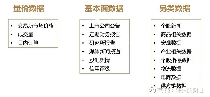 很多管理人都对外宣称他们积累的各种因子有几千上万个,但真正使用的也就几百个,从路演中听到各家提到使用比较多的因子大致可以分为:量价因子、基本面因子、另类因子。这些因子都是从对应的各类数据中挖掘出来的: