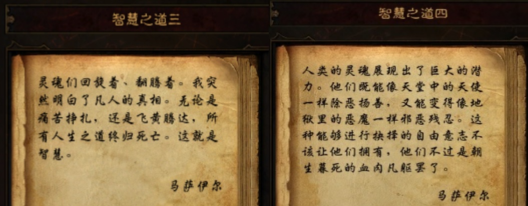 人类之为人类,正是因为其心又复杂又简单,有时欲望沟壑难填,会导致些许灾难,有时追求宁静无欲无求,有时勇气冲天,自愿为他人牺牲自己。庇护之地上的人类作为天使与恶魔的后人,集光明与黑暗于一体,因为人类天生就拥有感情,于是善良和爱成为人类最最简单的内心光明与黑暗的分水岭,马萨伊尔的智慧之道恰恰忽视了最重要的这一点,追求那从来没有绝对的绝对力量,结果只有灭亡。