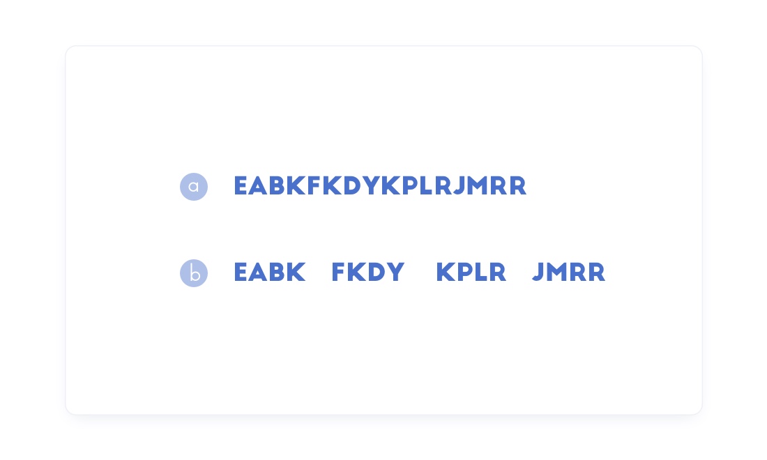 如下图a、b两串同样的字符,先看a这一串字符,能记住几个?再看b这串字符,又能记住几个? 我们将b字符进行分段,运用7+2法则,将一长串字符进行分段记忆,那么是否更加容易记忆。