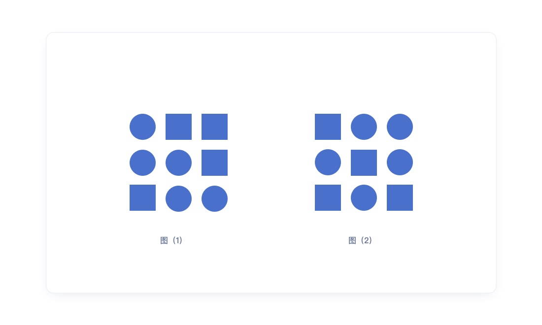 1.第一眼习惯性的会把左边看成一个整体,右边是另外一个整体。而不是把圆形和方形分别看成一个整体。越是临近的元素,越容易被看成相似的一个组,人的大脑第一反应会通过距离的远近来进行判别。