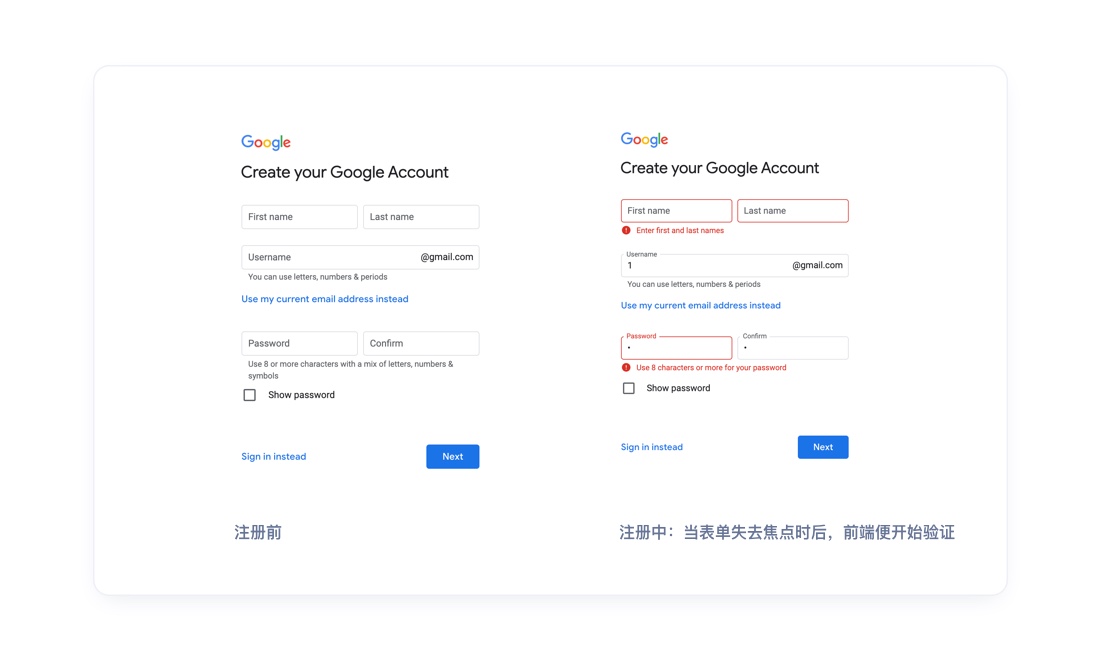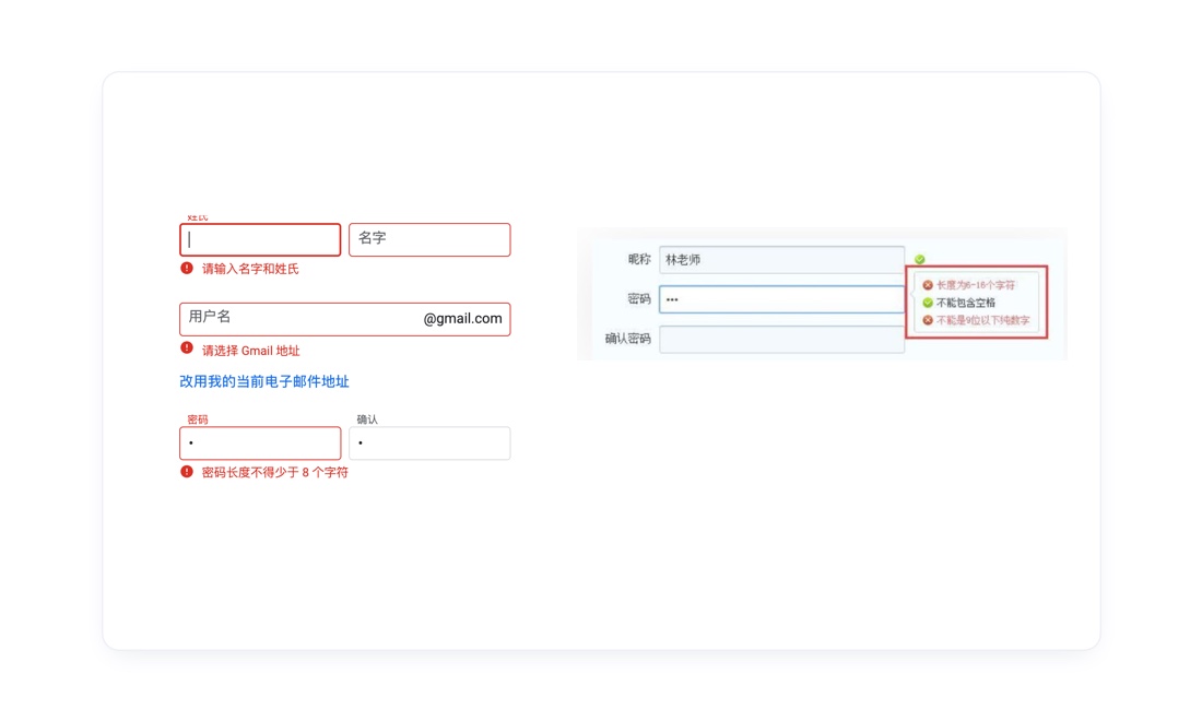 如在录入表单中,前端与后端及时检测录入信息的有效性和正确性,而不是让用户填写完所有表单再点击提交按钮之后,再来验证对错。如提交表单后再全部一起验证,这种反馈相对迟钝,虽然不会影响主体流程,但导致用户不能及时发现错误,而进行更改。而需要重新回过头再录入、再提交、再报错,这样会严重影响使用效率。