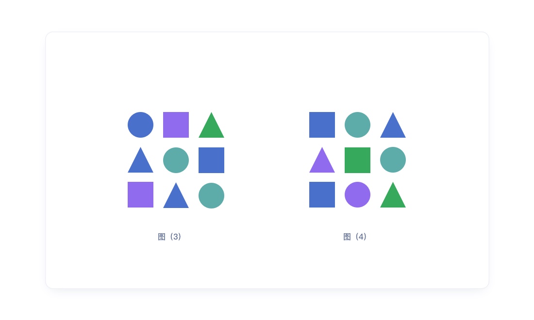 2.接近法则的“权重”非常大,甚者可抵消其他法则,比如为上图(1)、图(2)添加颜色,甚至改变形状,得到如下图(3)、图(4),我们仍会把接近图形当成一个组: