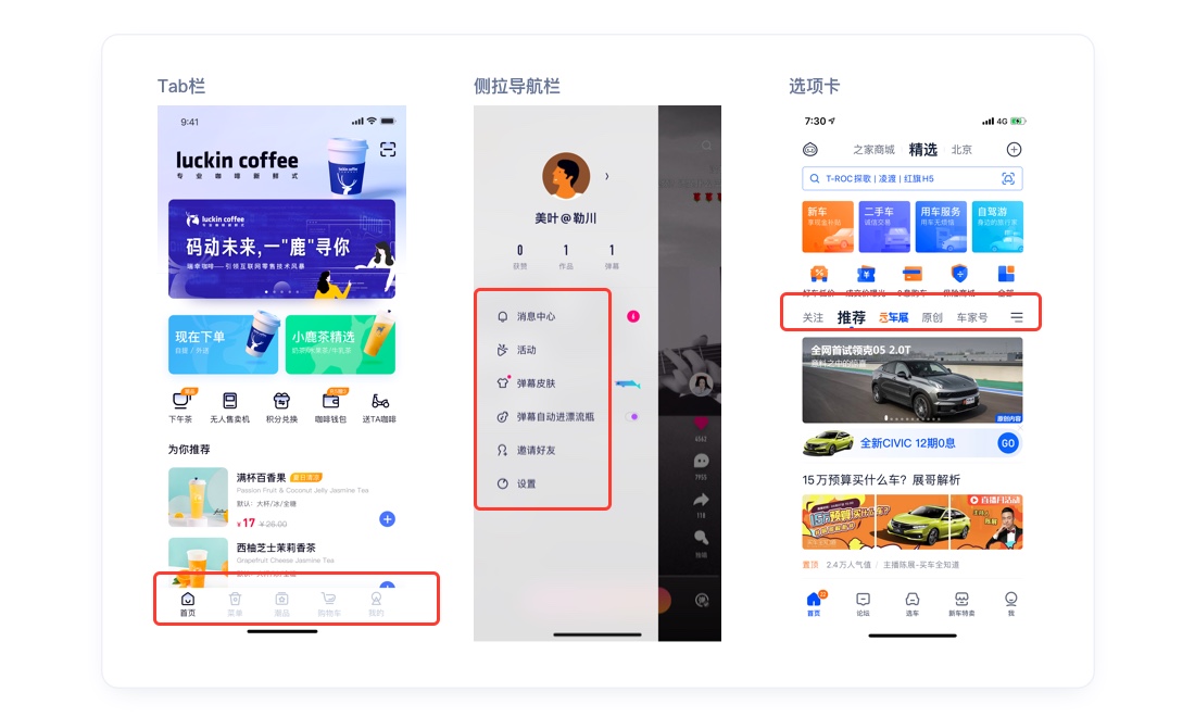 移动端中tab栏中数量一般保持在2-5个,最少不低于2个,最多不高于7个;