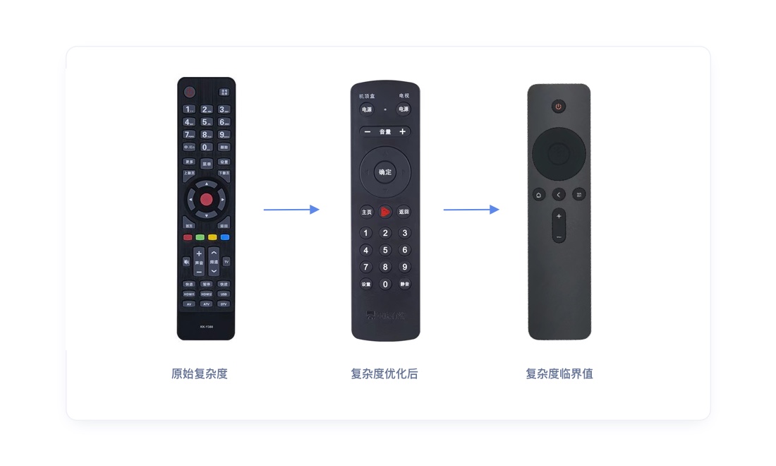 如遥控器中的很多按钮所指向的功能,只是将很多不是核心功能的按钮进行了合并,但是并没有删除它。但这化繁为简的背后是为了更好的提升用户体验,但产品、设计、开发或许会更多的付出,这或许也是一种守恒吧。即实际工作中也需要合理权衡复杂性守恒的原理的使用。