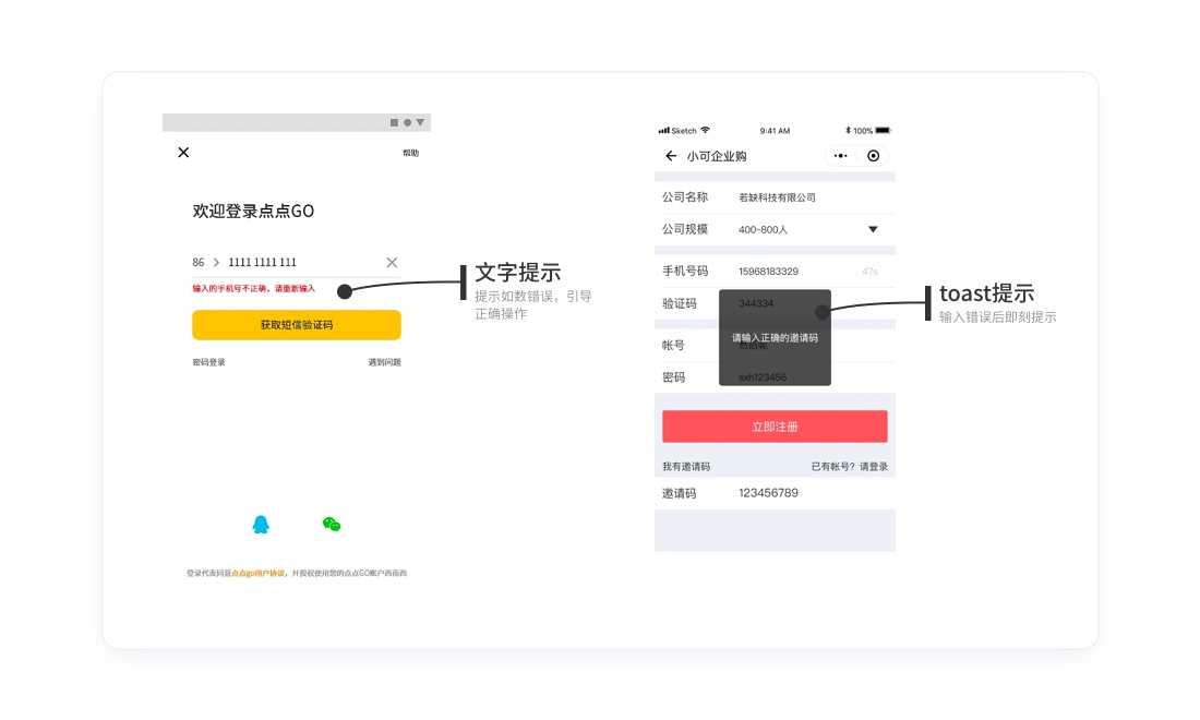 及时反馈能避免用户误操作的可能性,提高完成任务的效率。反馈不仅要指出有错,还要指出错在哪里,反馈文案需准确、友好(文案呈现方式最好是和用户聊天的形式,而非是在审问用户)。