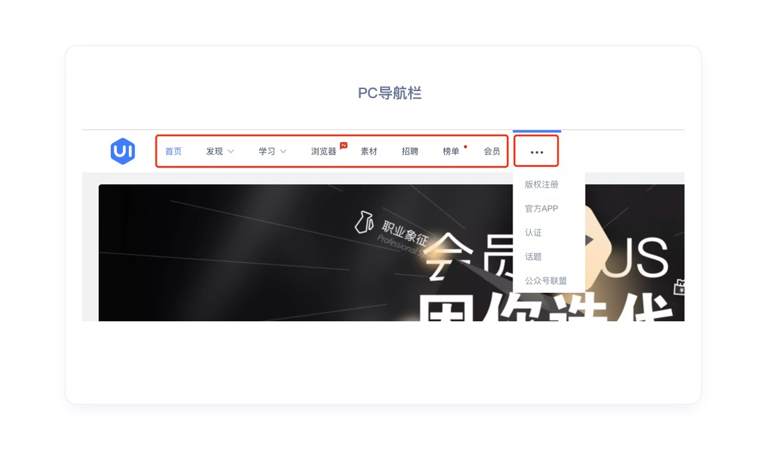 PC端的导航和选项卡通常都不会超过9个,如导航导航功能分类很多,则可以通过聚合的方式聚合一部分,但是聚合的那部分也需运用米勒定律(7±2法则)控制数量。