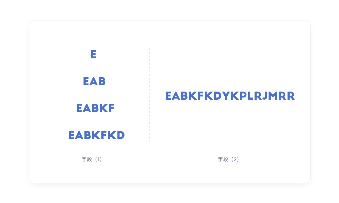 如下图 字段(1),字符为1、3、5、7,小于7个容易短时间看完且短暂记住。如字段(2),字符大于9个时,记忆难度先行加深,浏览时间更长,更不容易记住,只能记住其中几个或是开头和结尾几个字符。
