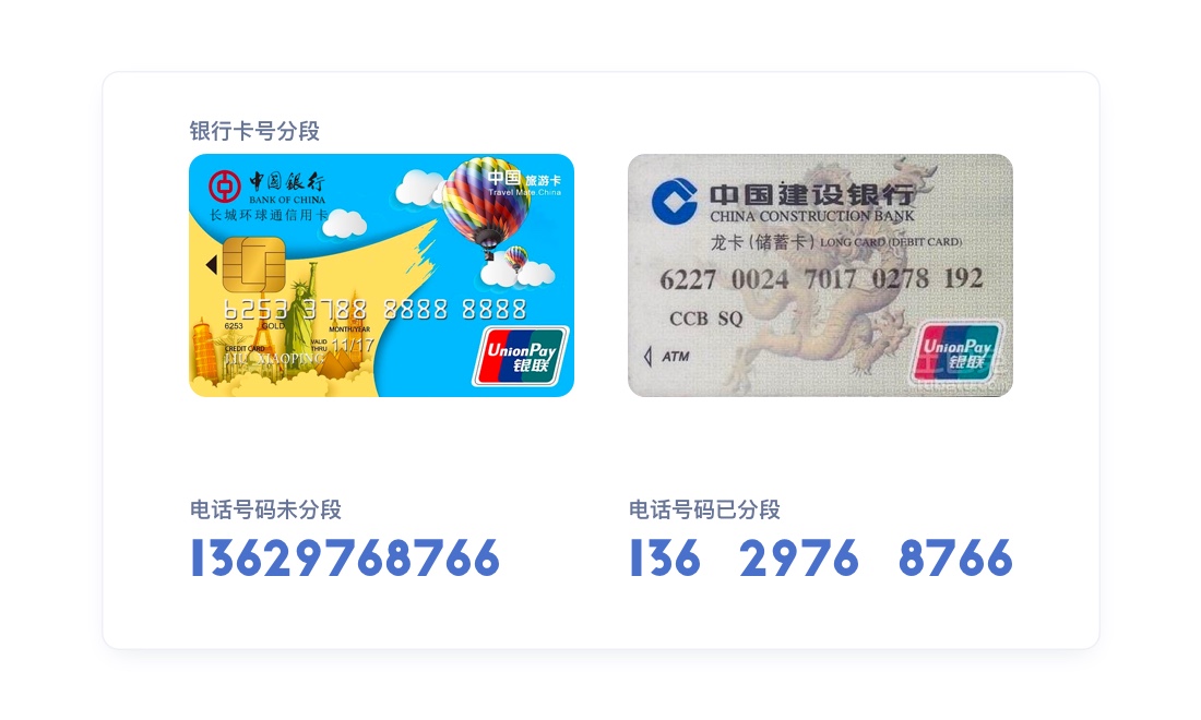 这样的例子很多,也源于我们生活。如银行卡号、手机号等等,都是进行了分段处理,控制在尽量少的字符以内,便于识别、记忆。