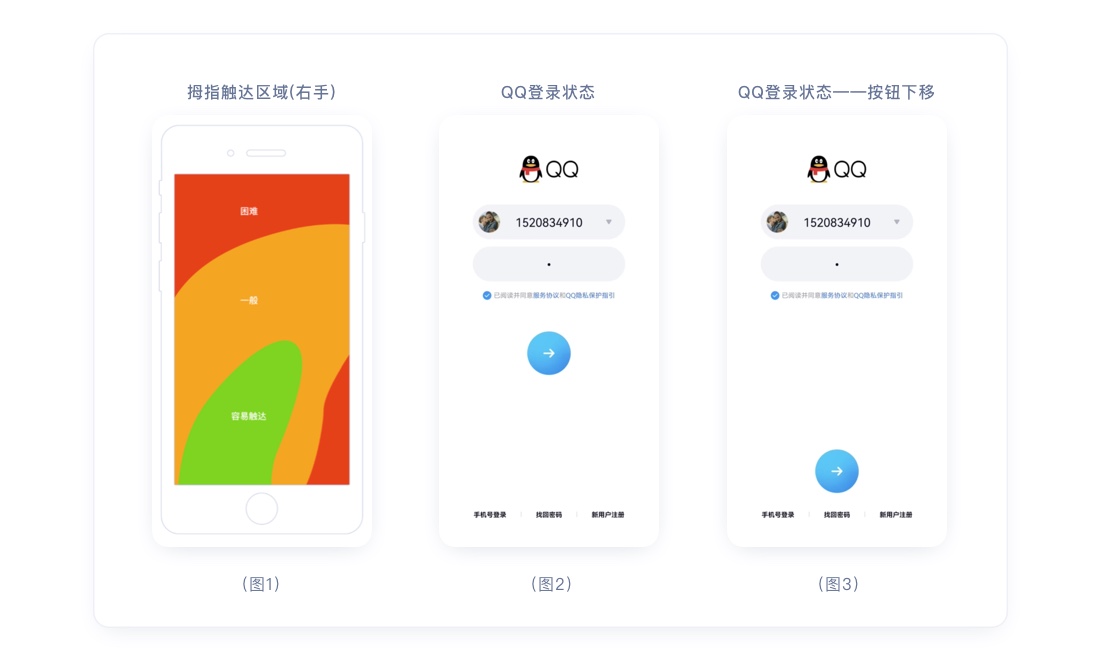 如QQ的登录界面(图2),输入框比普通的输入框更大,能更好的点击。登录按钮的面积恰好比大拇指端的面积大一些,且整个按钮的所在位置刚好在拇指的容易触达区域(图1),此按键的目标区域(W)于触达的距离(D)均是最佳的。