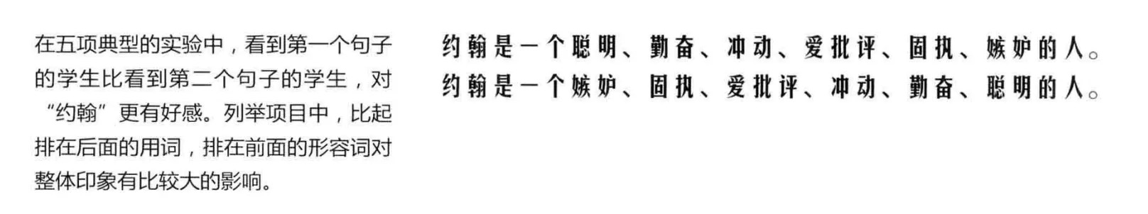 2.如下图文字,“约翰 是一个.....的人”,第一句和第二句给人完全是两个不同的感觉。第一句,我们首先会看到,约翰是一个聪明、勤奋...的人,因为首先出现了聪明、勤奋二字,那么就会给人友好的感觉。第二句,首先出现了嫉妒、固执,那么便会给人造成一种厌恶的感觉。这即是首因效应。
