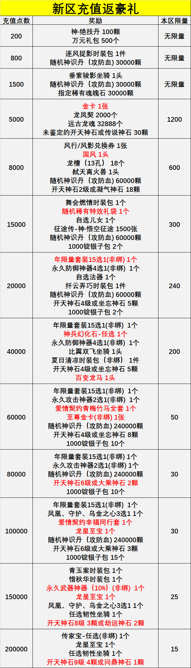 本次新区还将免费送:百件时装坐骑+韧性大件-万物生(600韧性)、全套五孔魂魄石,全套神龙附鳞,满星神兵,免费帝王觉醒、极品50星双法宝,全套极品200级马装,18件双攻满灵魂成品装备,包括双攻、高攻速移速、神龙觉醒,直升修为技能全激活,补天神石、职业宝石套、永久15紫星!畅玩新区,轻松获取极品号。