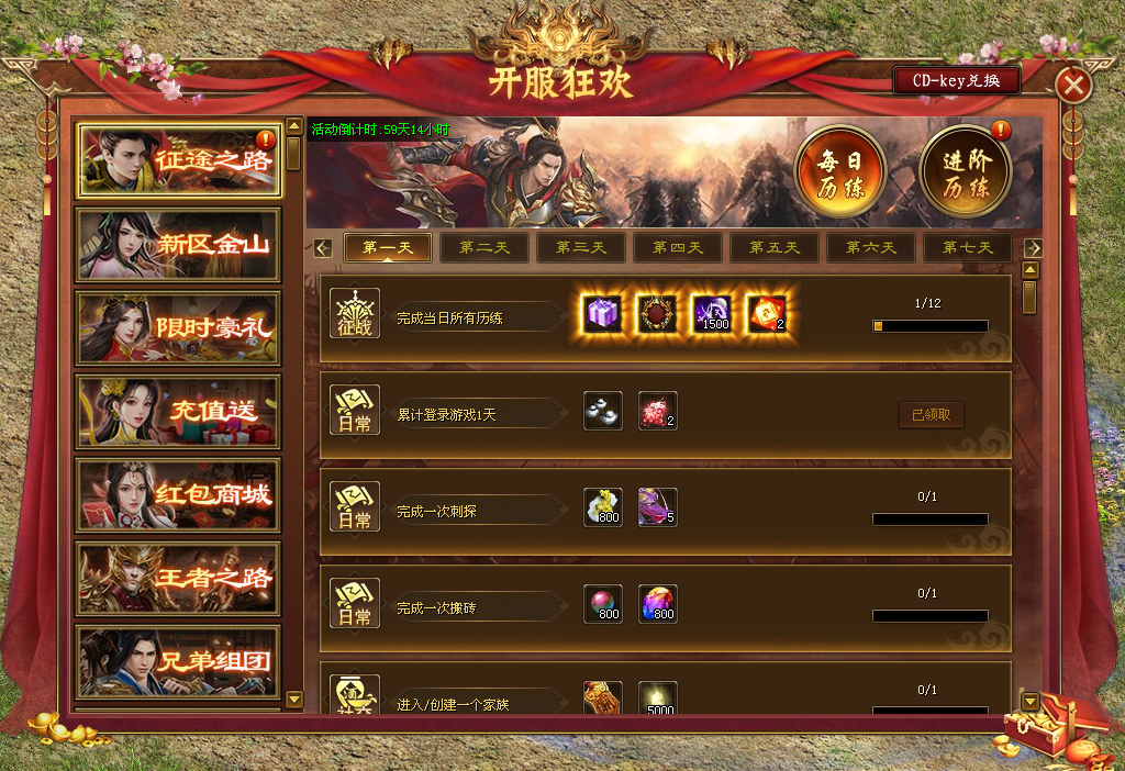 进阶历练:新区阶段内完成挑战任务可获得更加丰厚的奖励!全部进阶历练完成可获得称号“新区·登峰造极”,此外还有永久神器、炫酷套装、大量极品法器、极品儿女、各类激活石道具等你来拿!
