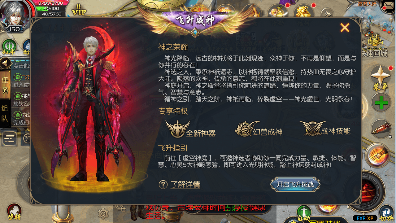 完成“成神之路”任务的神选者可参加飞升成神任务,正式版魔域官方下载前往虚空神庭,邀请他人助你一同完成力量、敏捷、体能、智慧、心灵5大神殿考验——完成考验,进入光明神域,踏上神坛获封成神,获得神祇专享特权!