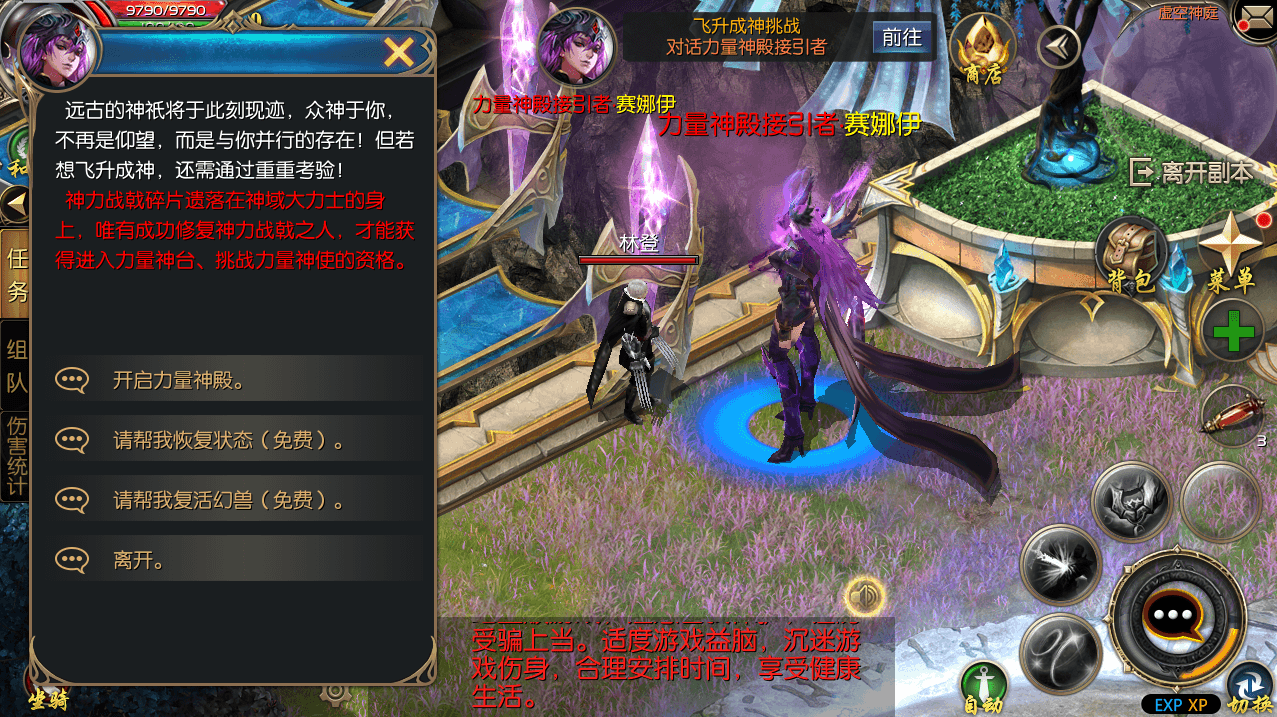飞升成神第1关——力量神殿,通过力量神殿接引者赛娜伊开启力量神殿,飞升者须在力量神殿中完成如下考验: