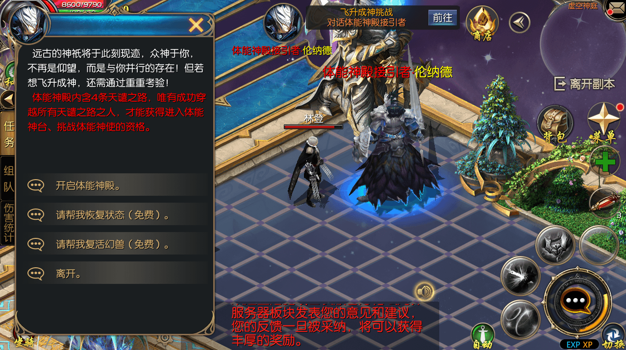 飞升成神第3关——体能神殿,通过体能神殿接引者伦纳德可开启体能神殿,飞升者须在体能神殿中完成如下考验: