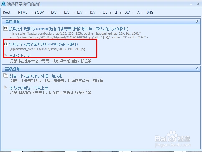 设置要抓取的内容,选择元素循环列表中的任意一个元素,在浏览器内找到该元素对应的图片,点击后弹出对话框,选择【抓取这个元素的图片地址】为字段1,同时我为了方便识别,还抓取了字段2为图片标题名称,设置原理同图片地址。