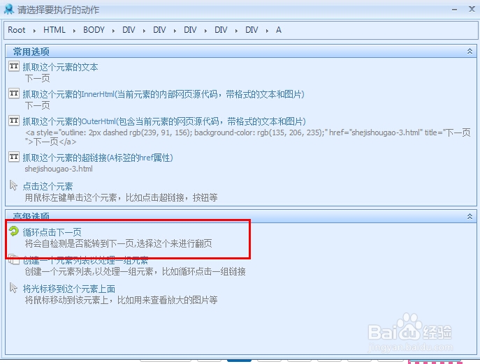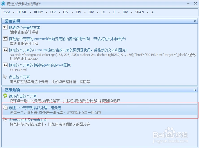 建好翻页循环好,就是采集当前页上的内容,我要采集图片的URL,就选中一个图片,然后单击,软件会自动弹出对话框,先建立一个元素循环列表。当前页面的所有元素都被抓取后,循环列表则建立完成。