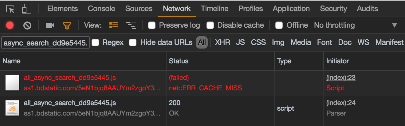 这两个请求的 URL 是一模一样的,上面那个是原来的请求,被屏蔽了,会报 ERR_CACHE_MISS 的错误,下面那个是异步发起的请求。