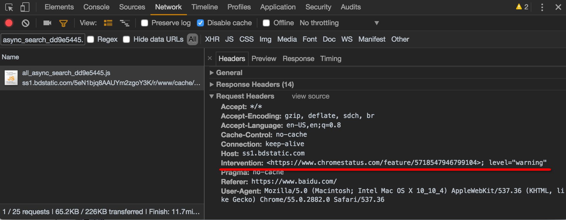(2)为了通知这个脚本所在的服务器,“你的脚本被我屏蔽了”。脚本被屏蔽后异步发起的请求会被 Chrome 添加一个特殊的请求头 Intervention,值是一个对应的 chromestatus 网址: