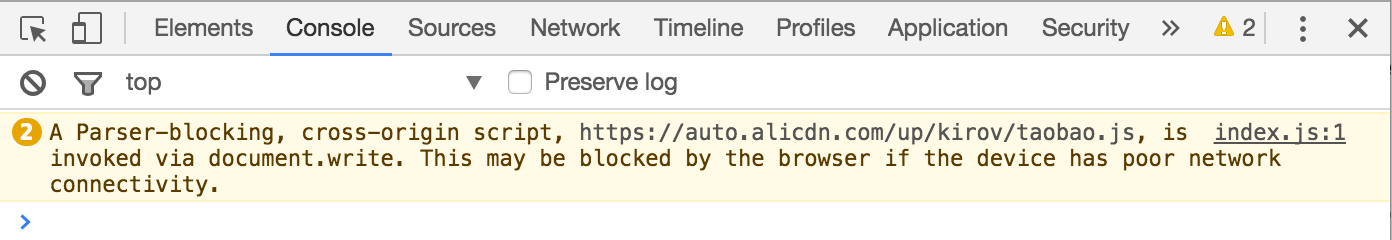 从 Chrome 53,也就是目前的稳定版开始,开发者工具的控制台中会出现下面这样的警告(即便脚本已经被缓存或者页面是通过刷新操作打开的,也会出现这个警告):