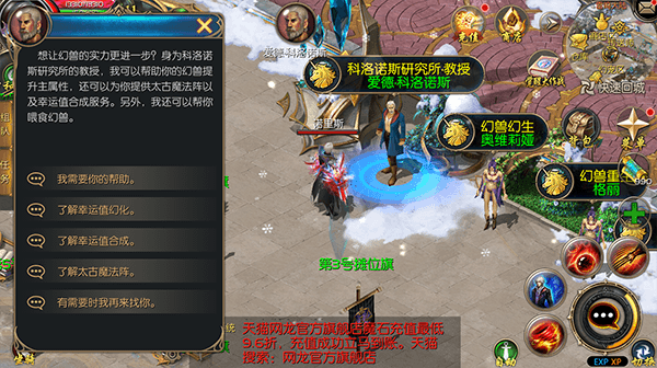 在游戏中,共有3种幻化仪式:主属性幻化、幸运值合成以及太古魔法阵,每一种仪式都可成为一只终极幻兽诞生的助力!