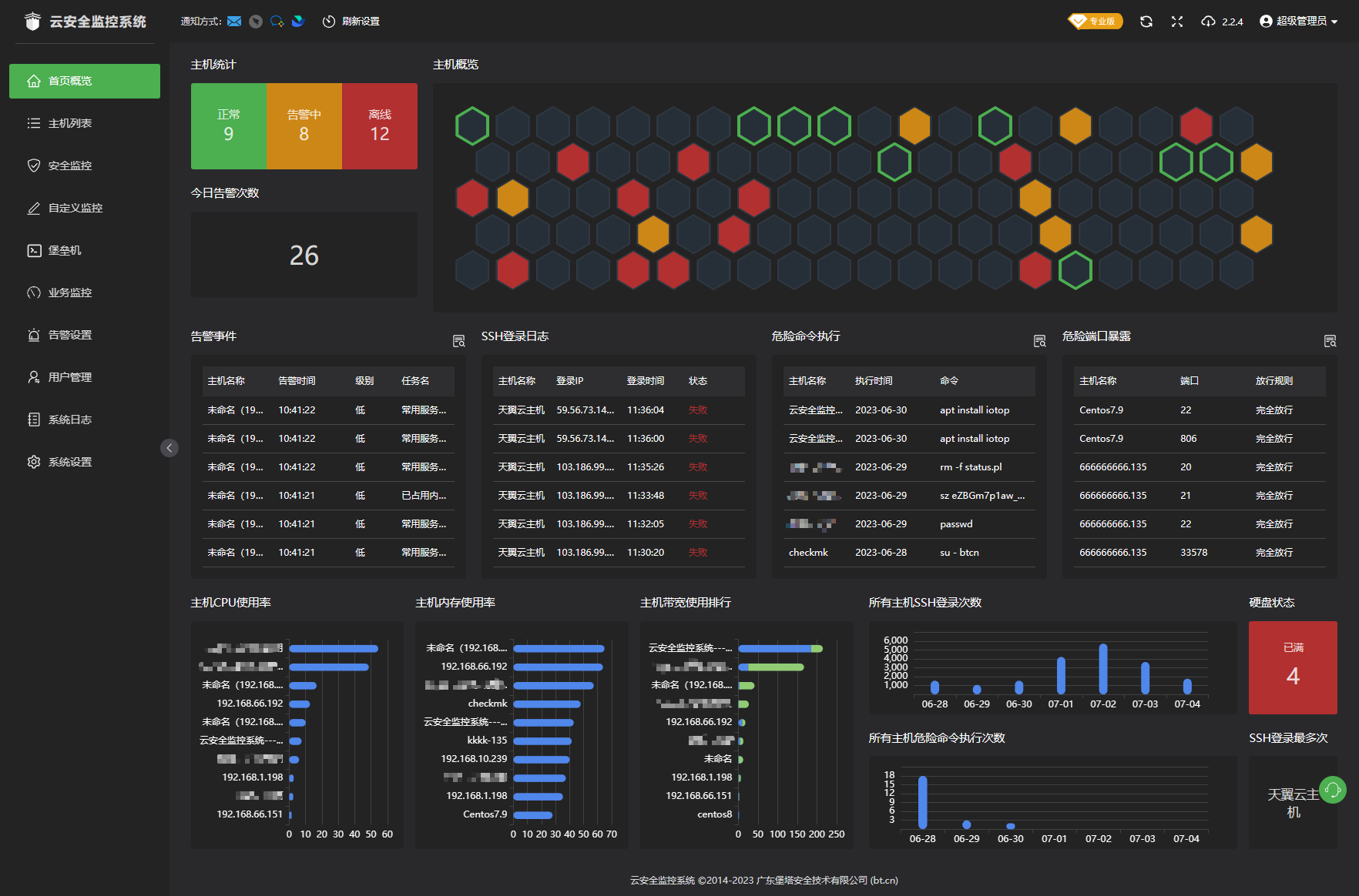 花几分钟就能开始监控你的服务器安全性、一键扫描服务器集群病毒、漏洞、挖矿木马。作为堡垒机批量管理你的服务器SSH终端、面板,操作录像回放,方便审计。24小时监控,实时发送告警(支持飞书、钉钉、企业微信、邮件)帮助运维人员快速定位故障。