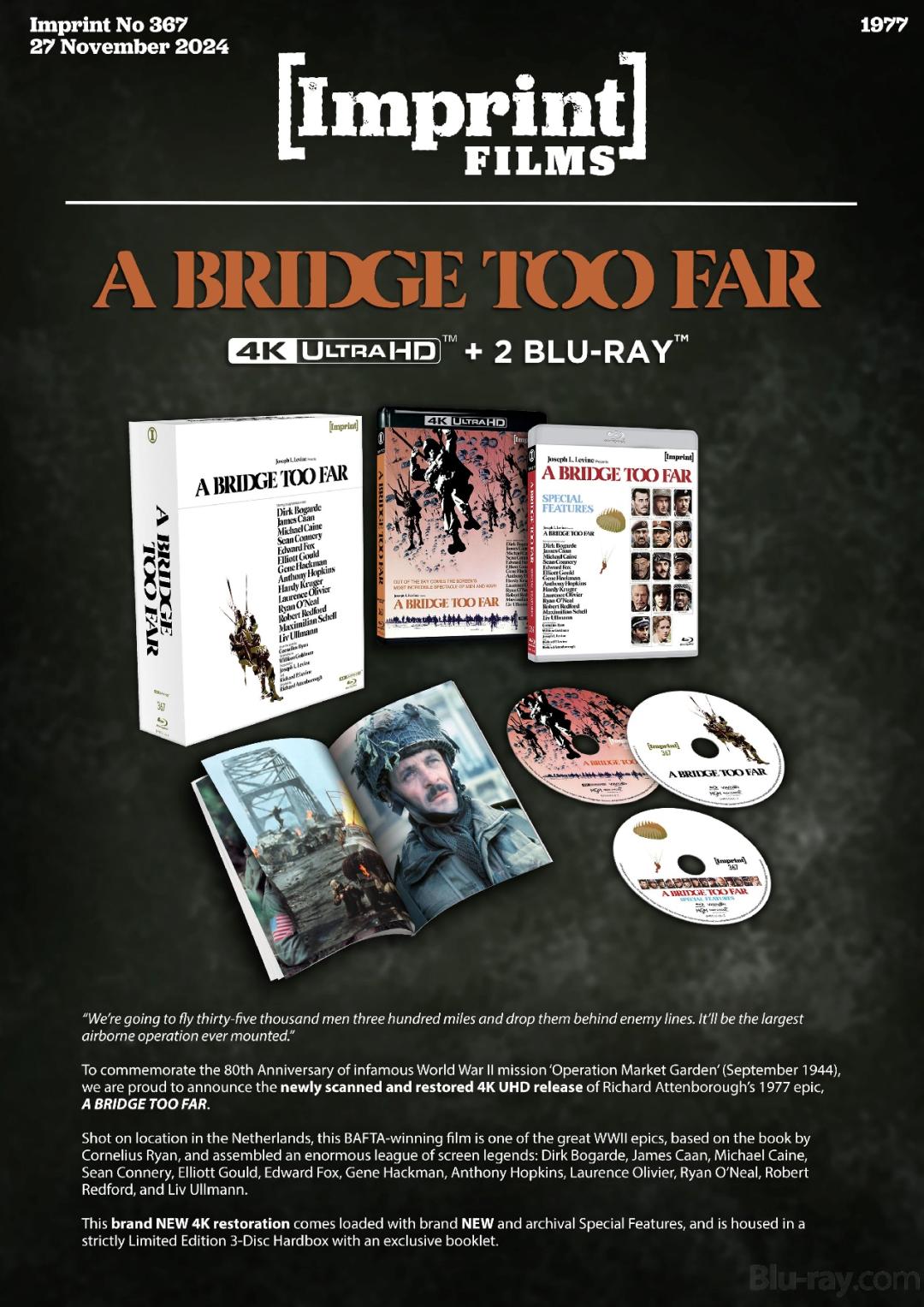 除去《沙漠妖姬》外,Imprint还从米高梅片库中授权且出资独家修复了全明星卡司的二战片《遥远的桥》,理查德·阿滕伯勒导演的这部1977年作品虽然在影评界口碑一直反响平平,但是接着豪华卡司与大场面的实拍效果,让其在战争片粉丝中有着不可动摇的地位。此次Imprint版对原始底片进行的4K修复,将以兼容HDR10的杜比视界规格呈现于UHD碟。音轨除了更符合现代标准的5.1外,原始的4.0立体声规格也得以保留。