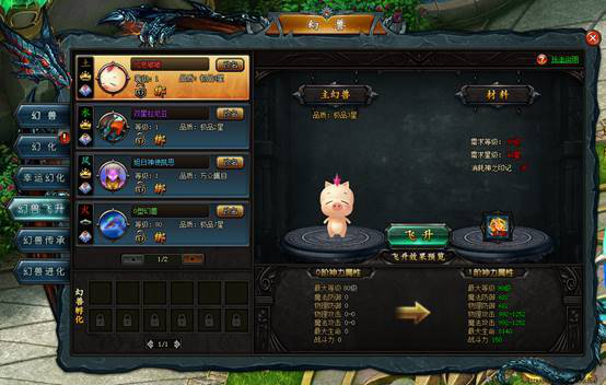 幻兽可以通过幻化来提升幻兽的星级。幻兽可以通过消耗和自己同种族的幻兽或者O型幻兽来进行幻化。如果幻化中使用了幸运草,即可获得最大的成长属性。幻兽每次幻化都会消耗一定的精力值。精力值可以通过使用精力果补充或者在线自动恢复。另外,值得一提的是,当幻兽在幻化至50星时,副幻兽的相性必须与主幻兽相同。玩家可以使用奇异果来改变幻兽的相性。如果主幻兽使用了电浆药水,即可将幻兽的相性变为雷属性,雷属性的幻兽在幻化时就不需要副幻兽有相性要求啦!大大节省了我们的操作。