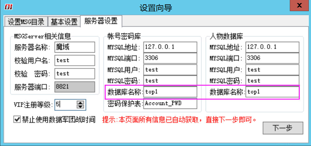 3、继续点击“下一步”,修改数据库名称,大部分的版本账号密码库和人物数据库是合并在同一个数据库里的