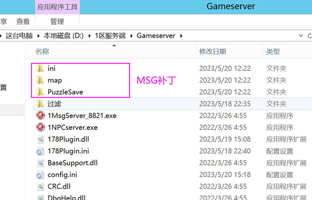 6、如果你的魔域版本有配套的服务端MSG补丁,需要将补丁上传到服务端的Gameserver目录;如果没有配套MSG补丁,则使用通用的服务端MSG补丁。