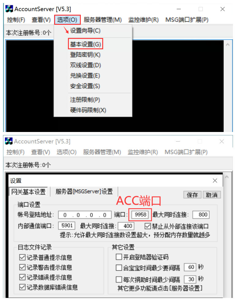 6~8、显示名称可以随便写,游戏真实名称不要乱改,需要和服务端引擎里的一样;IP地址就是你的服务器外网IP地址,本地单机架设的则使用局域网IP;ACC端口可以在服务器网关菜单 “选项” → 基本设置里查看,如下图: