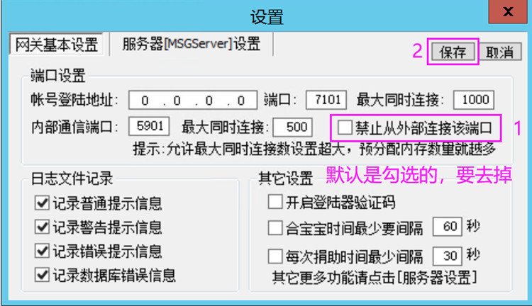 如果你勾选这个,会导致MSG端无法连接上账号服务器,玩家将无法登录游戏。