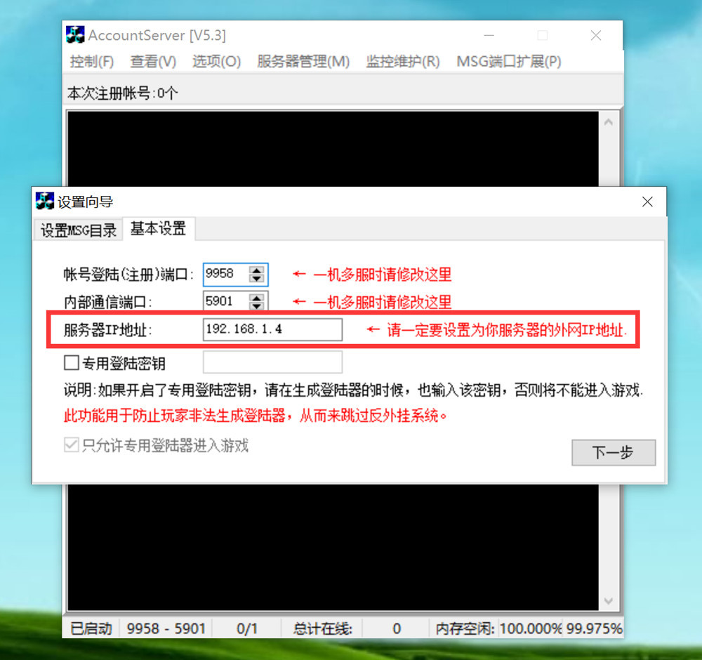 2、点击“下一步”,填写服务器外网IP地址(本地单机架设的填写局域网IP)
