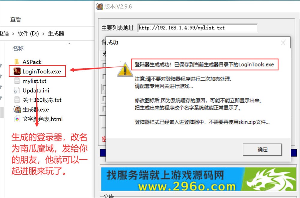 9、登录器这里可以勾选封各种外挂,还可以选择登录器样式,点击“开始生成”按钮,会在当前目录下生成一个名为LoginTools.exe的程序,这就是登录器,你可以把LoginTools改成你自己游戏的名称,然后压缩成zip,上传到服务器或者QQ群里,让你有朋友下载一起玩;