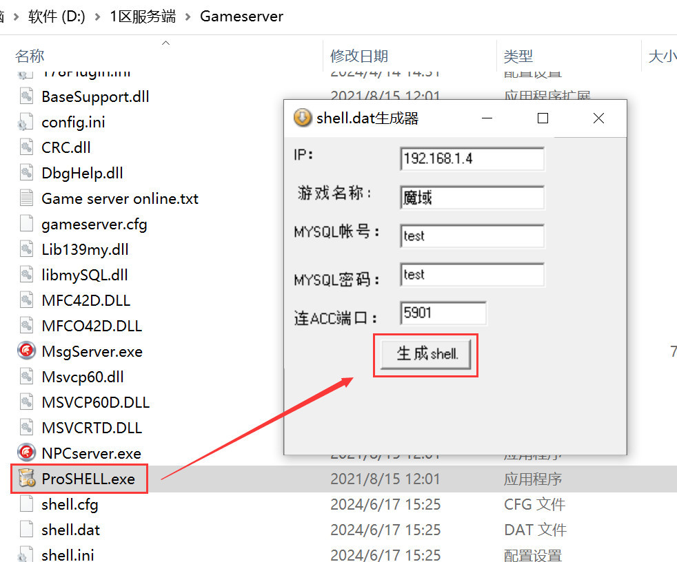 5、双击打开服务端引擎/Gameserver/ProSHELL.exe这个程序,然后点击“生成shell”