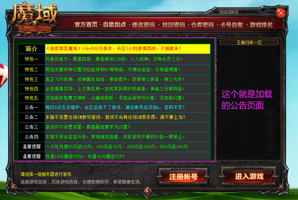 2、公告地址,表示登录器公告窗口要加载的页面,我们可以在公告里简单介绍游戏和放置GM公告,如下图: