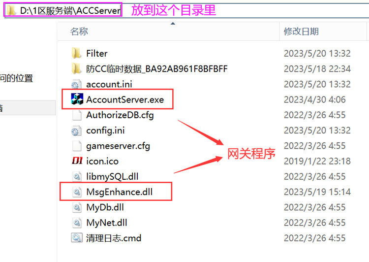 4、将网关里的AccountServer.exe和MsgEnhance.dll文件复制到服务器引擎里的ACCServer目录,如下图: